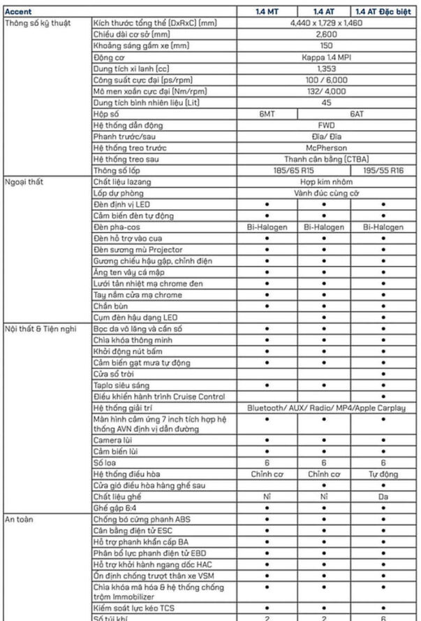 Bảng so sánh thông số kỹ thuật các phiên bản Accent 2021